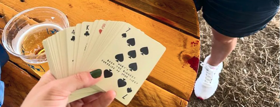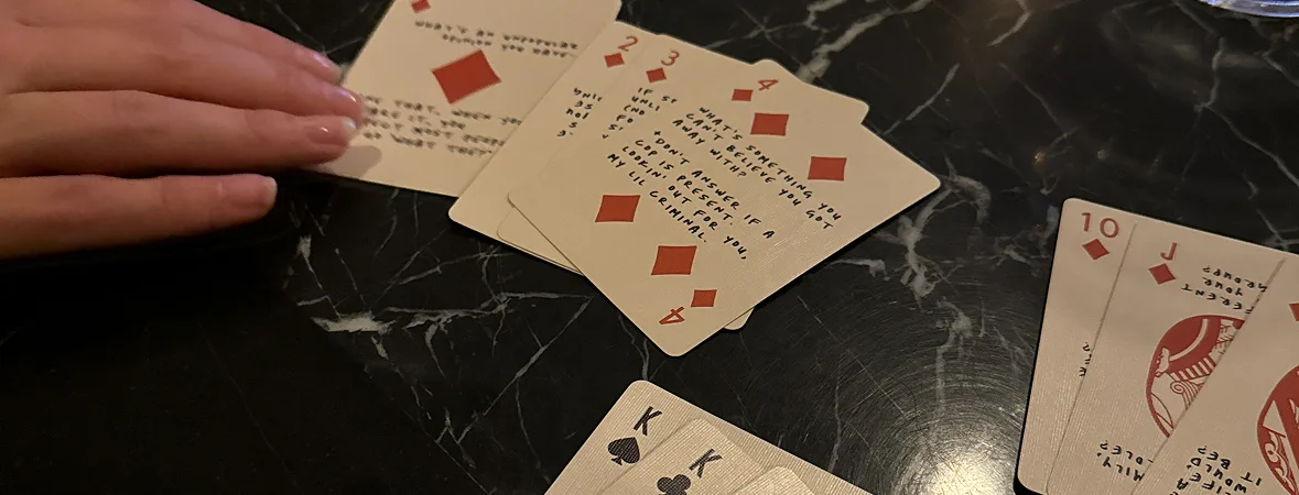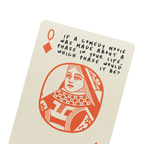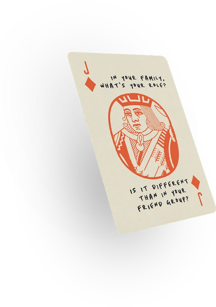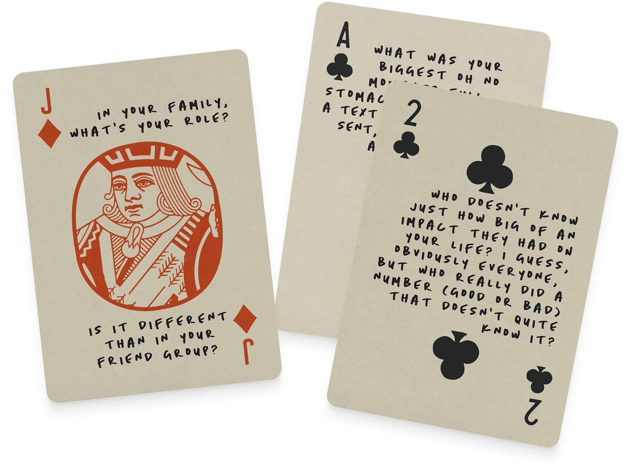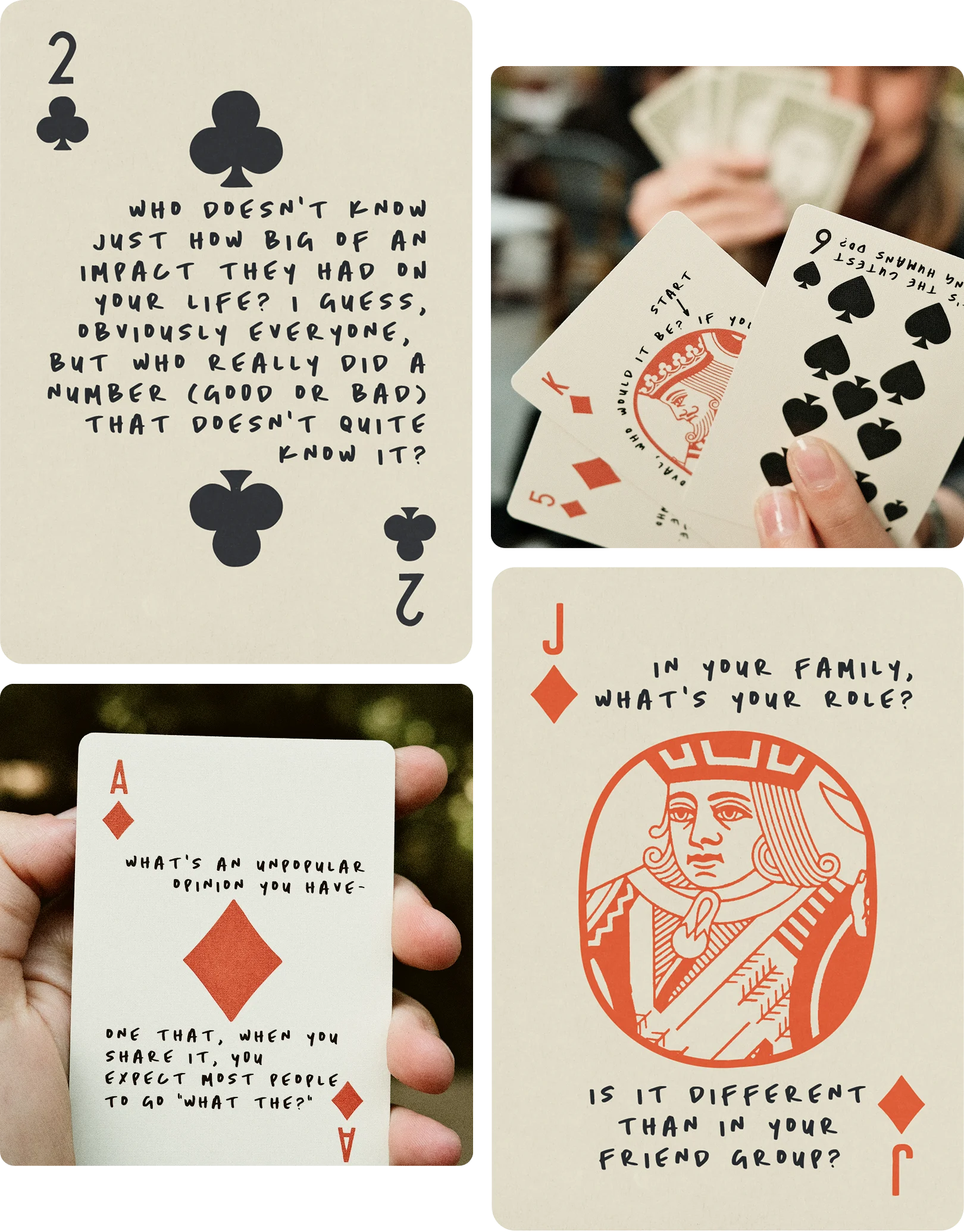 a full deck of playing cards with thought-provoking questions to spark conversations during game night, date night, or any other social meet-up.