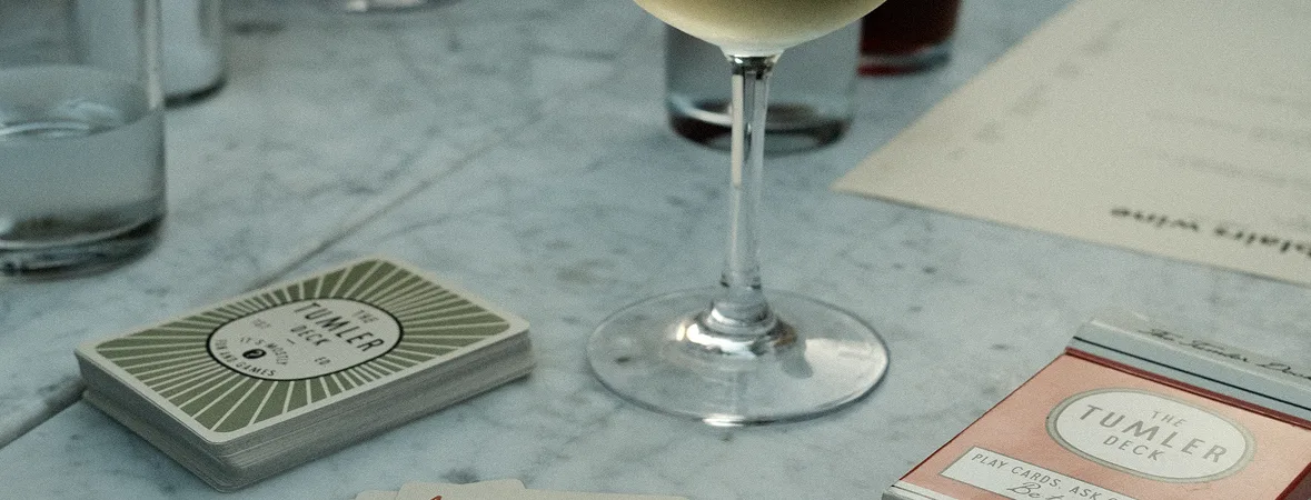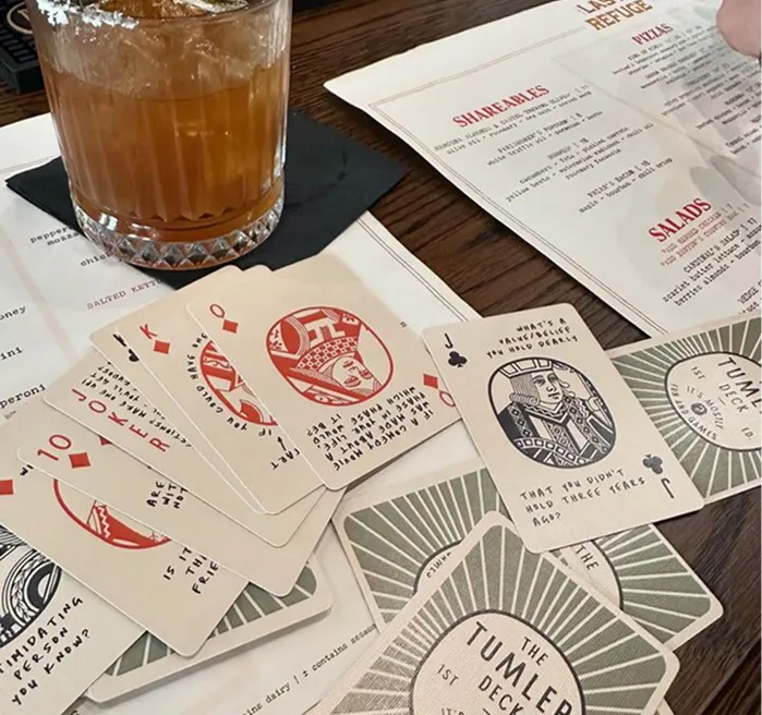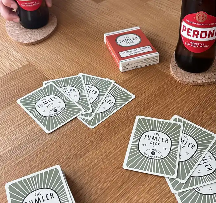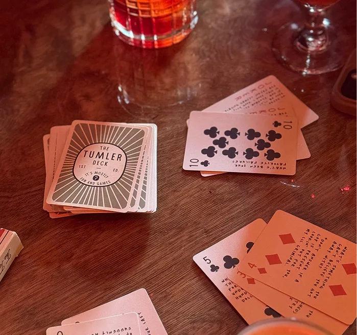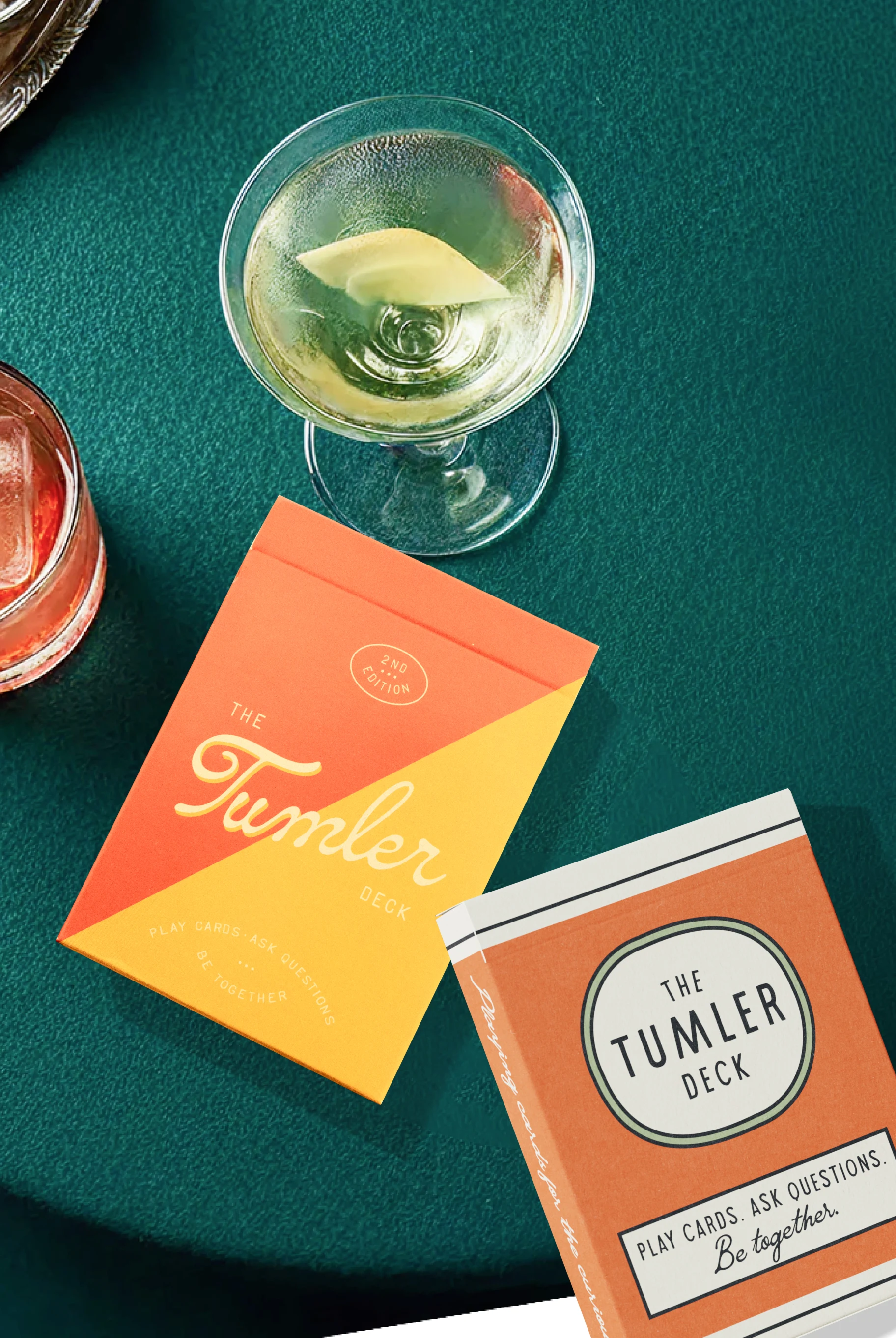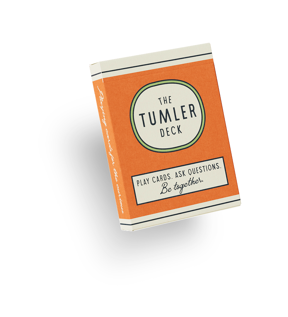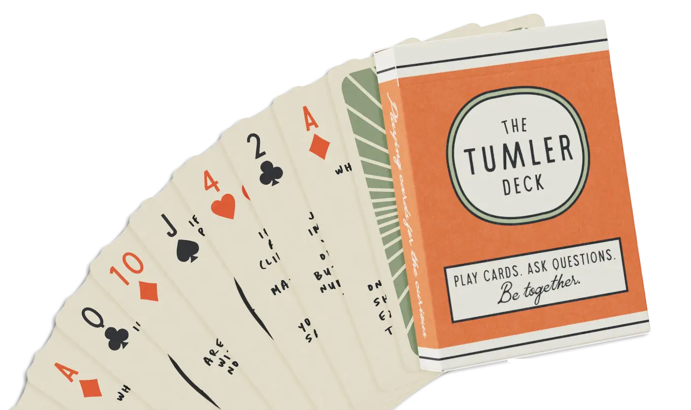 the tumler deck is a single deck of playing cards featuring thought-provoking questions, designed to be the "tumler"—the starter—for games and conversation in any group. It combines the utility of a standard playing card deck with conversation prompts, embodying the spirit of getting the fun going.