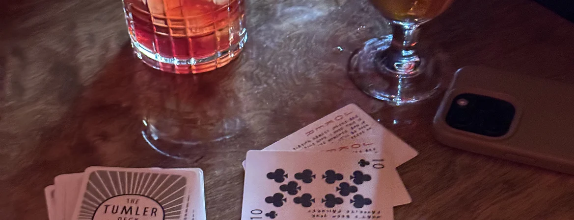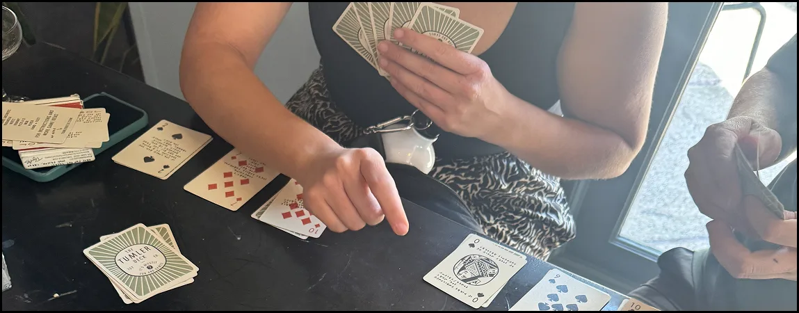 Hands holding playing cards with a box labeled 'The Tumler Deck.'